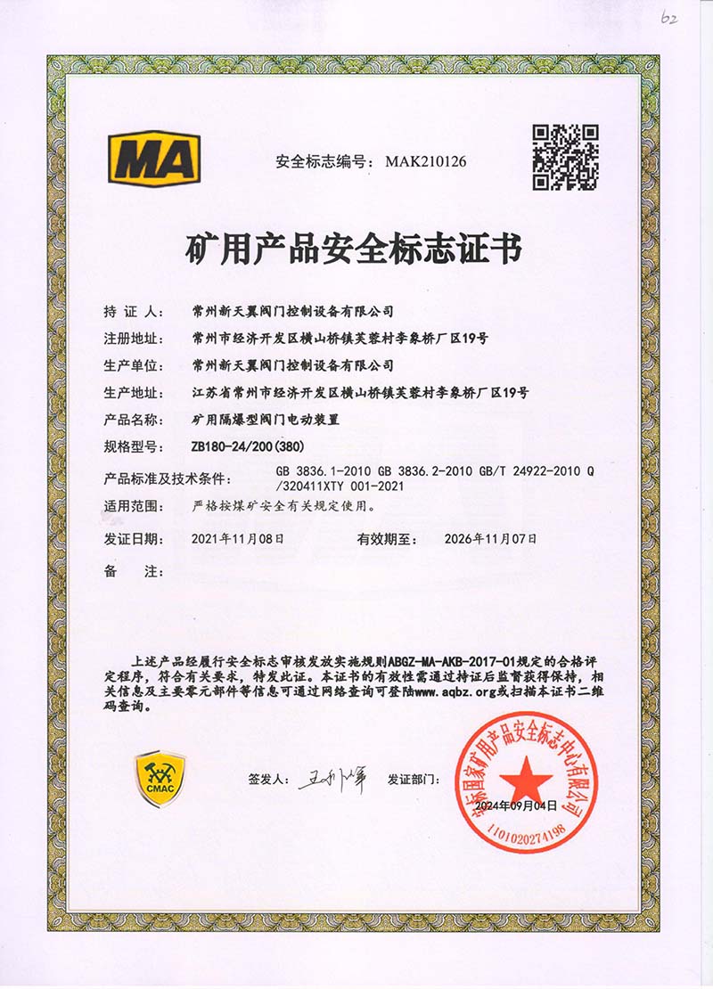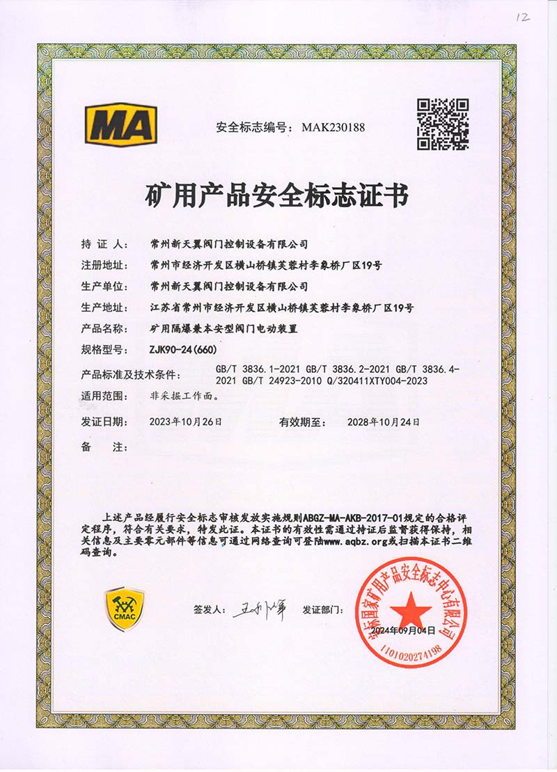 礦用產品安全標志證書ZJK180-24(380)